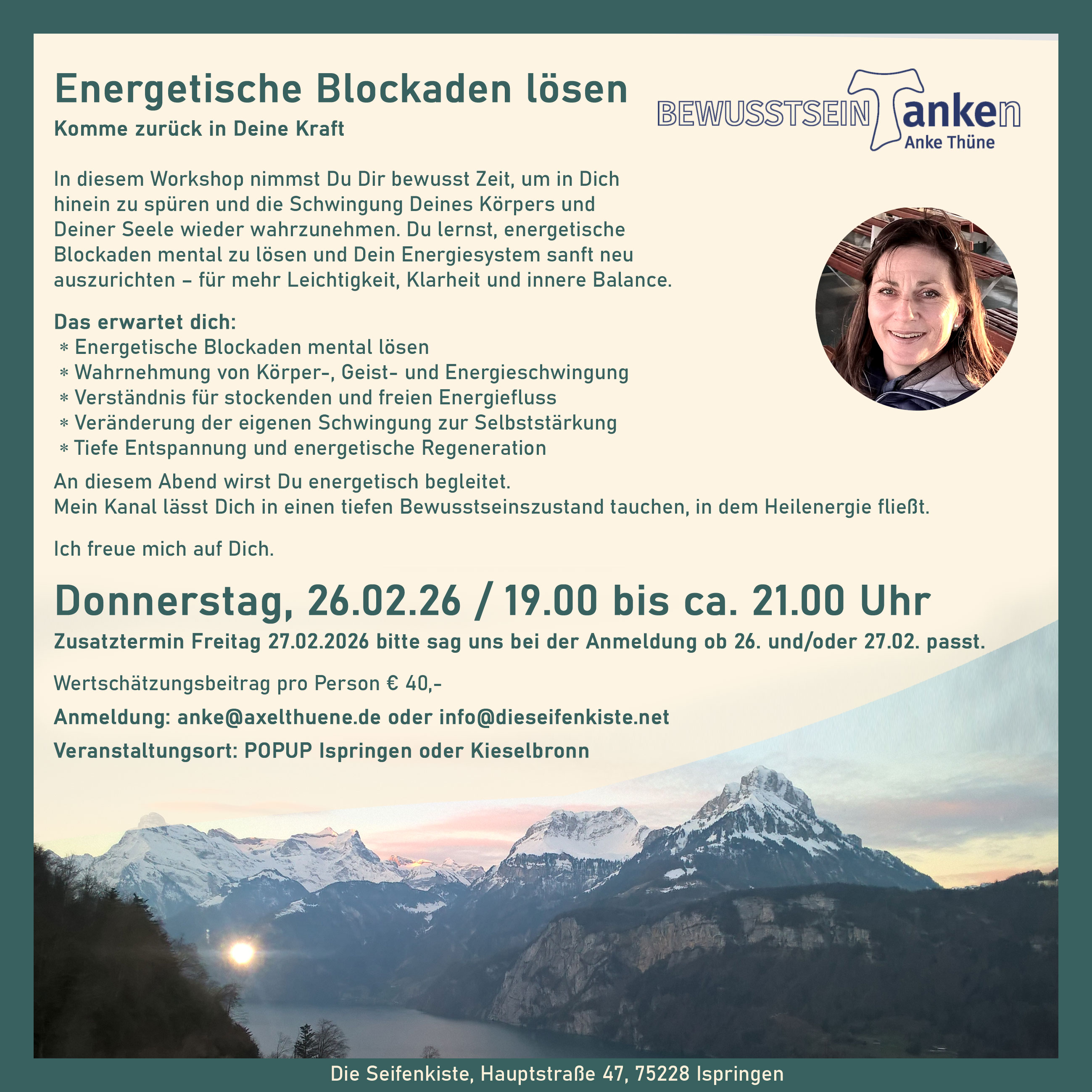 Donnerstag, 26. Februar 2026 – Bewusstsein tanken mit Anke “Energetische Blockaden lösen”